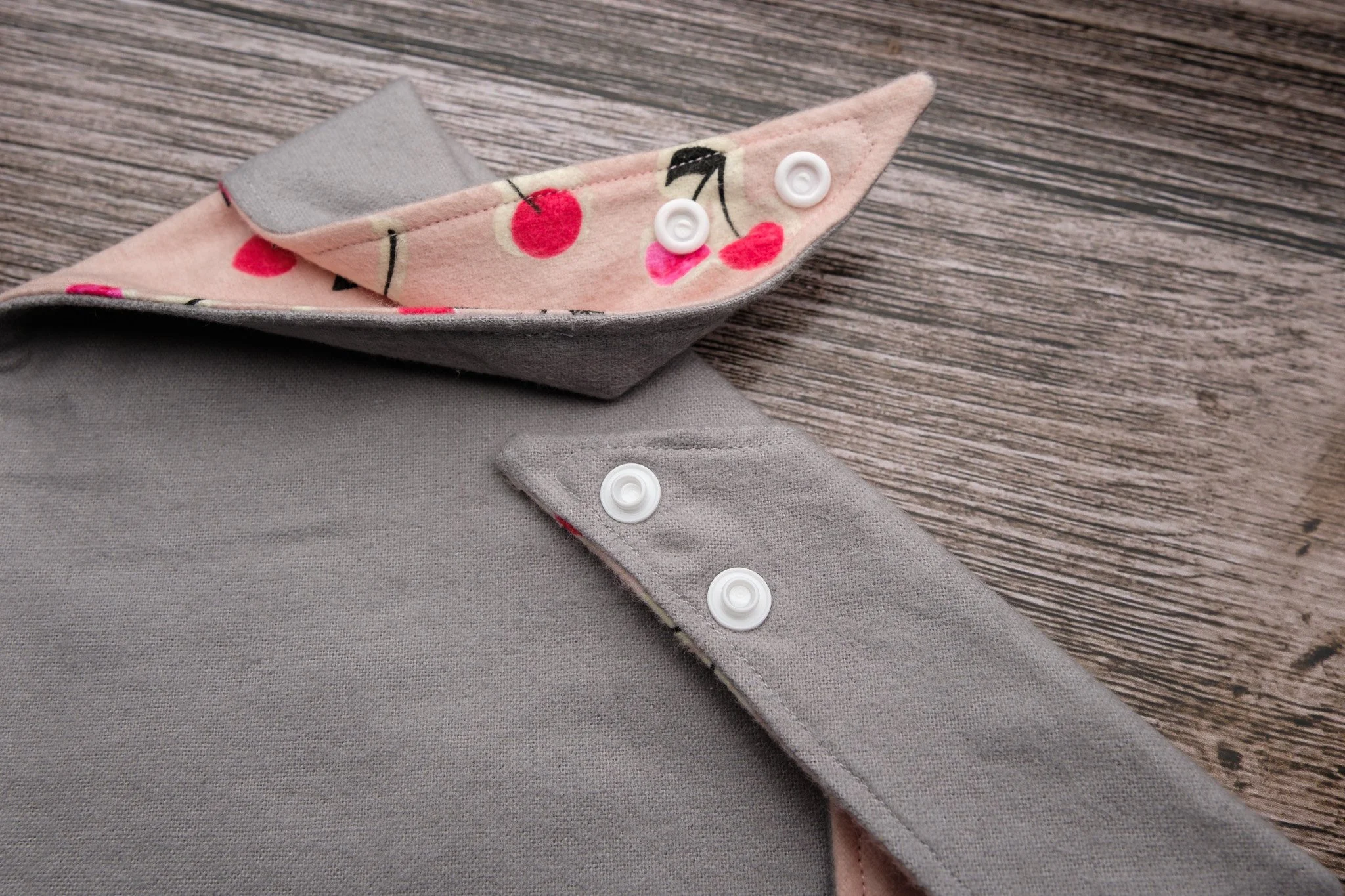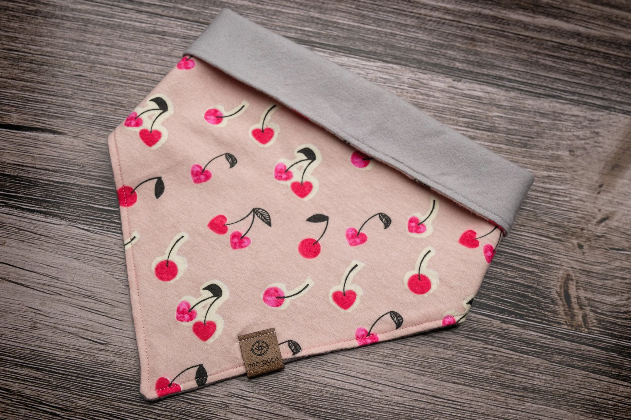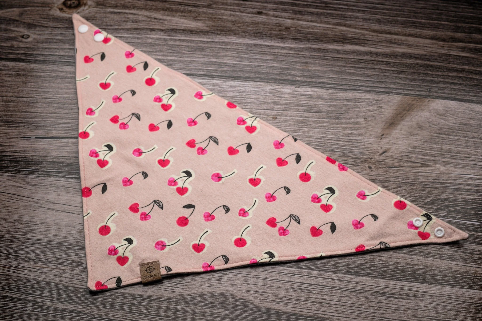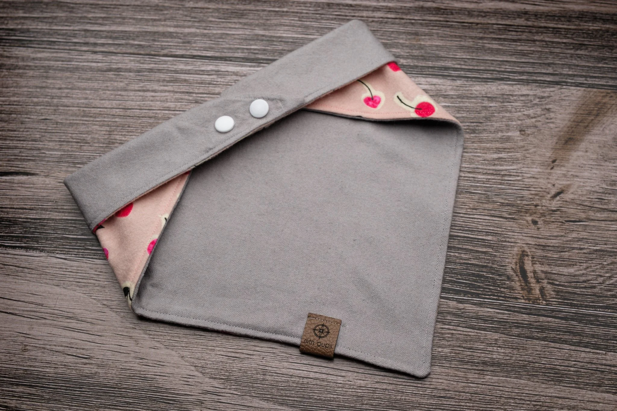 This reversible bandana features the perfect combination of Valentine’s Day love that’s sophisticated and adorable. Printed side contains bunches of heart shaped cherries with a light pink background and the reverse is a solid light grey, which offers year-round wear. The top stitch coordinates beautifully with the pink and grey, giving the bandana a finished and professional look. 2 button snaps offer more flexibility in sizing.